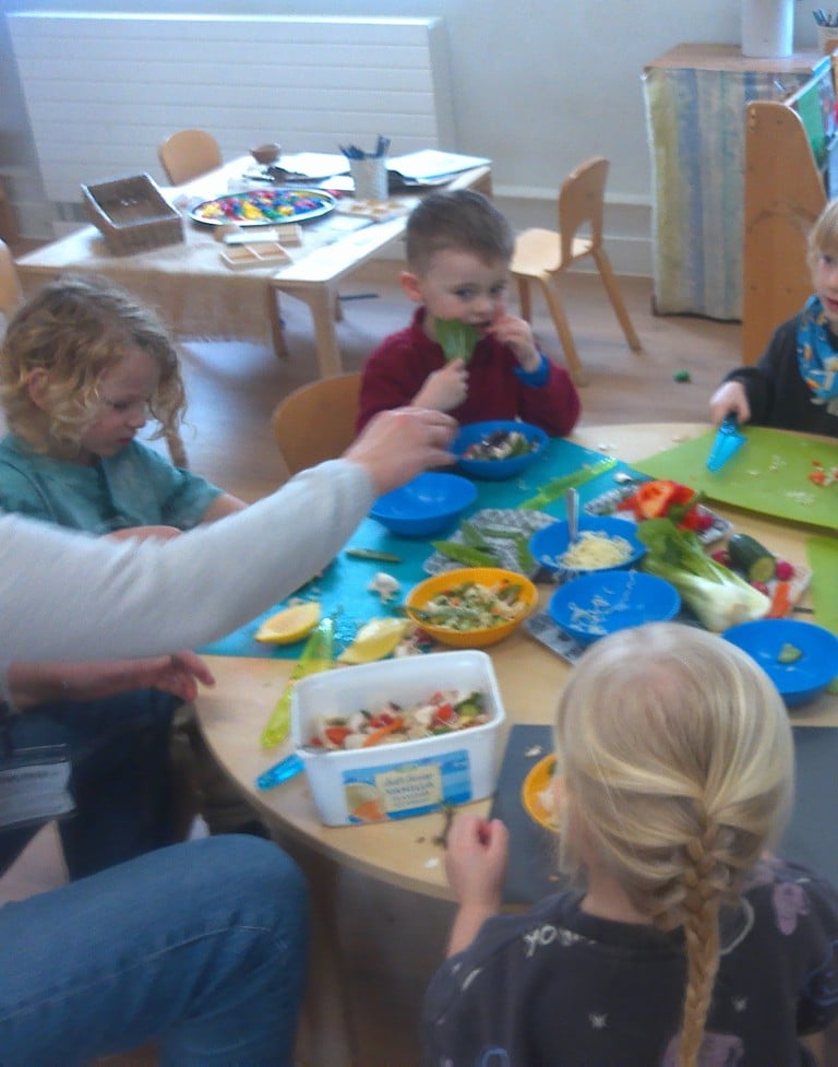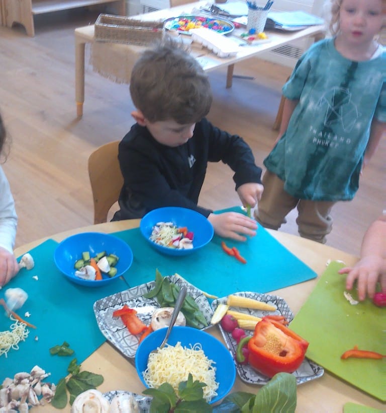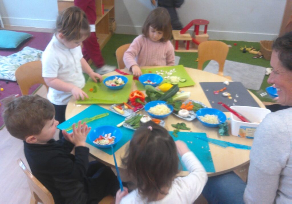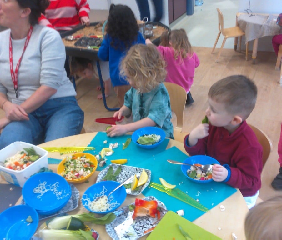 Klaudia and Kelly came this week from the Children’s Kitchen to work with our children in Fox and Hedgehog rooms. The children prepared the food making a noodle dish, cutting and tasting the ingredients whilst developing practical cooking skills and exploring new flavours and textures.