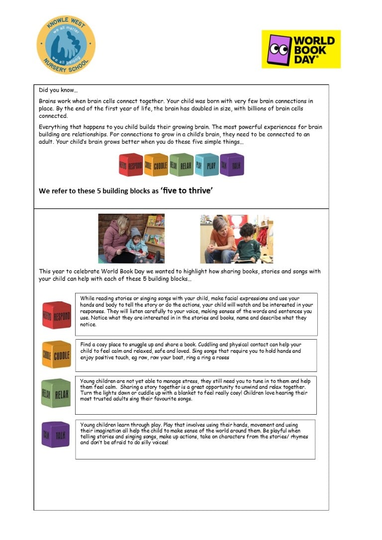 Knowle West Nursery School celebrated World Book Day with a series of reading‑focused activities that brought families and staff together to highlight the importance of stories in early years education. Throughout the week, parents and carers were invited to stay during morning drop‑off to share books with the children, creating a calm and engaging start to the day and supporting the Early Years Foundation Stage emphasis on communication, language and a love of reading.