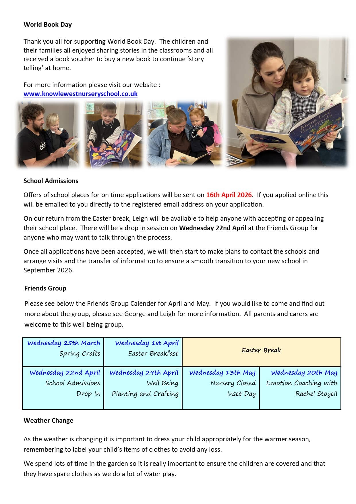 In our latest newsletter from Knowle West Nursery School, you can read about the many exciting things happening across our community this term. Inside, you’ll find highlights from World Book Day, updates on school admissions, and upcoming activities from our Friends Group. We also share important diary dates for the term ahead, including end‑of‑term closures and special events.