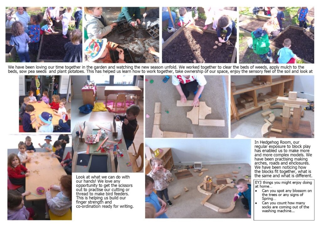 In Hedgehog Room, our regular exposure to block play has enabled us to make more and more complex models. We have been practising making arches, roads and enclosures. We have been noticing how the blocks fit together, what is the same and what is different.