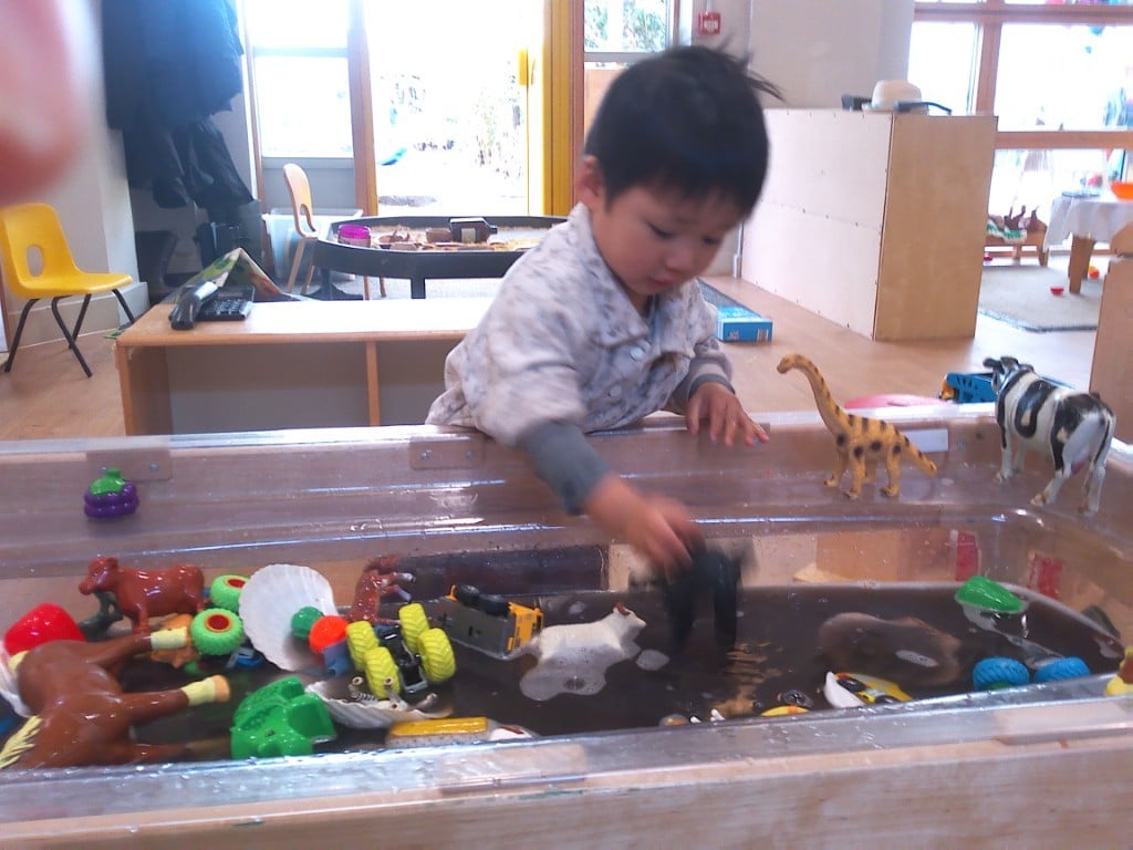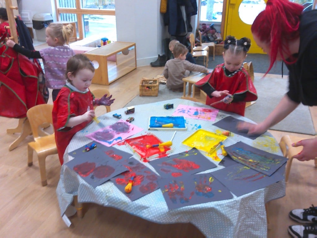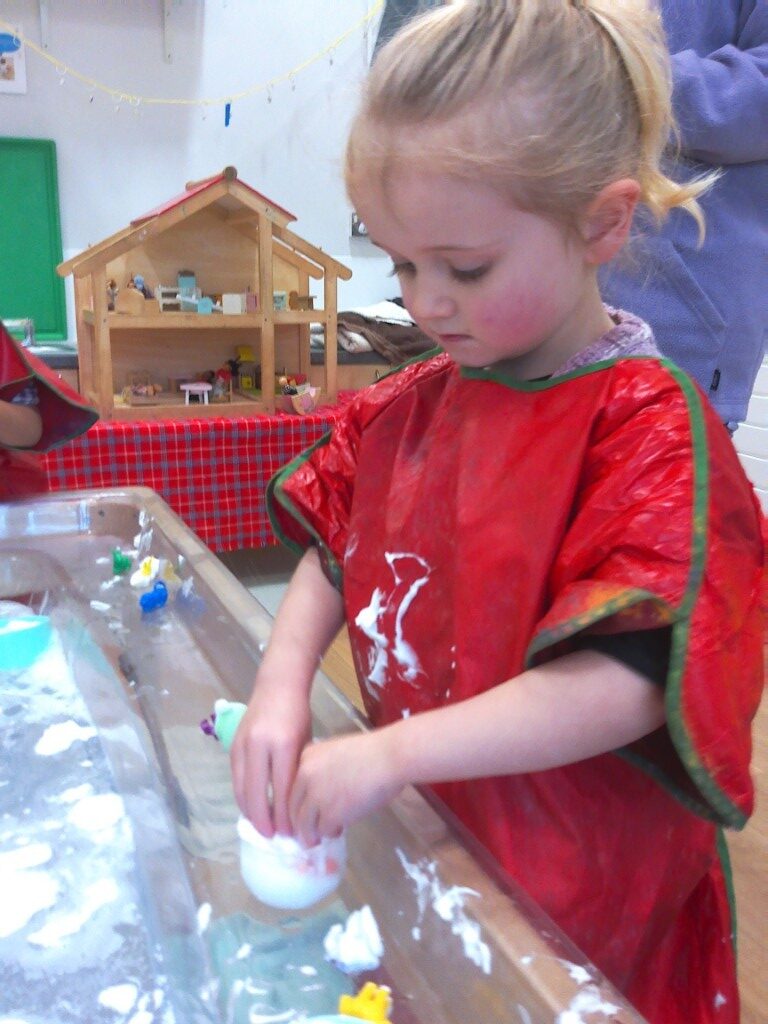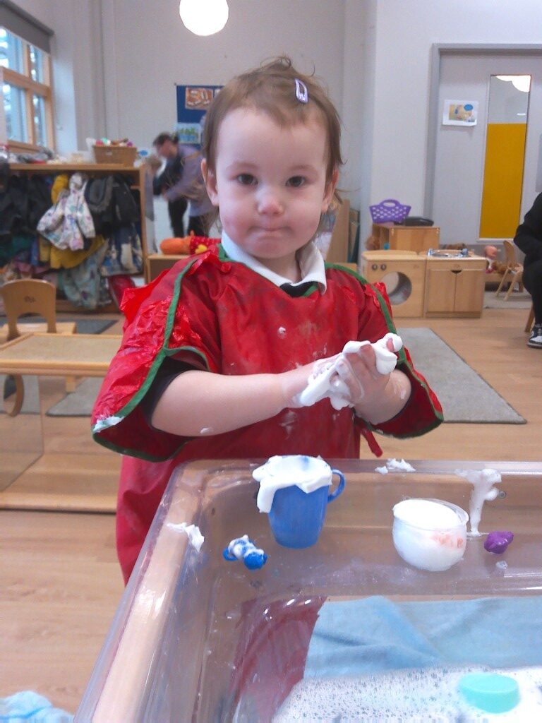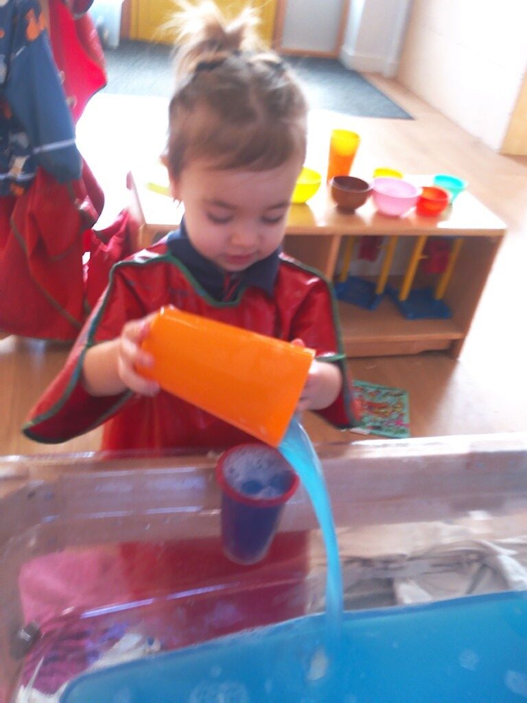 Washing animals and practising filling and emptying containers helped children build independence and coordination, as well as extending their language as they described what they were doing. Painting with their hands gave children the freedom to explore mark-making in a sensory way, strengthening fine motor skills and offering opportunities for self-expression.