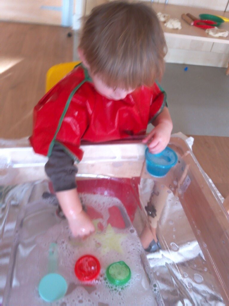 Children in the Bumblebee Room at Knowle West Nursery School have been deeply engaged in hands-on sensory play, using their fingers to explore a wide range of materials. Through these experiences, children have been talking together about colour, texture and smell, and sharing how different materials make them feel.